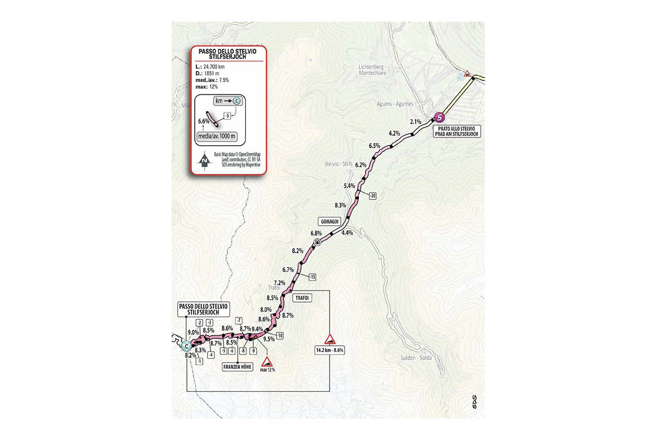 Tappone alpino con sole quattro salite per oltre 5400 m di dislivello. Partenza in salita sul Passo Campo Carlo Magno che porta in Val di Sole e dopo circa 45 km si affronta l’inedito (strada di apertura recentissima) Passo Castrin/Hofmahdjoch che porta in Val d’Ultimo/Ultental. La lunga discesa su strade ampie, ben pavimentate serpeggianti a mezza costa porta ai sobborghi di Merano dove si riprende a salite da Foresta/Forst entrando in Val Venosta e risalendola quasi per intero. Si affronta quindi lo Stelvio [2758 m] dal versante più impegnativo (quasi 25 km al 7.5% di cui metà oltre i 2000 m) e quindi immediatamente dopo la lunghissima discesa (numerose brevi gallerie nella parte centrale) la salita finale ai laghi di Cancano con le “scale di Fraele” e i loro 21 tornanti perfettamente ritmati sul fianco della montagna.