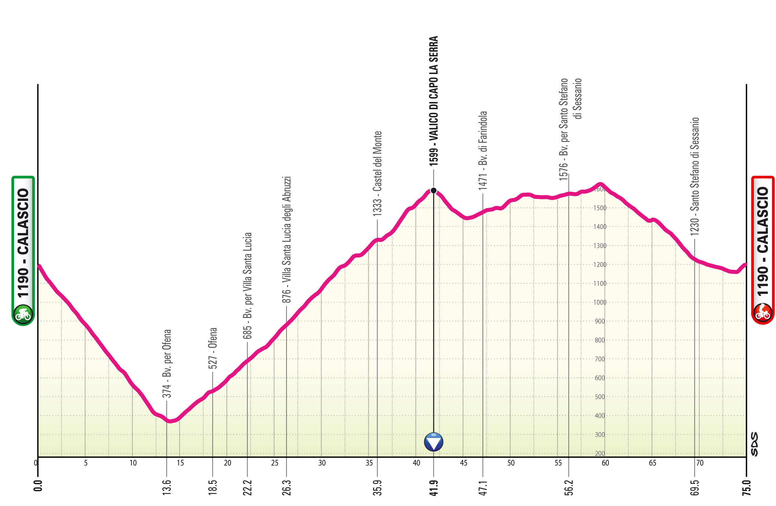 Questo anello inizia con una lunga discesa da Calascio fino al bivio per Ofena dove inizia una salita di oltre 28 km al 4% medio senza veri picchi (max 9%).