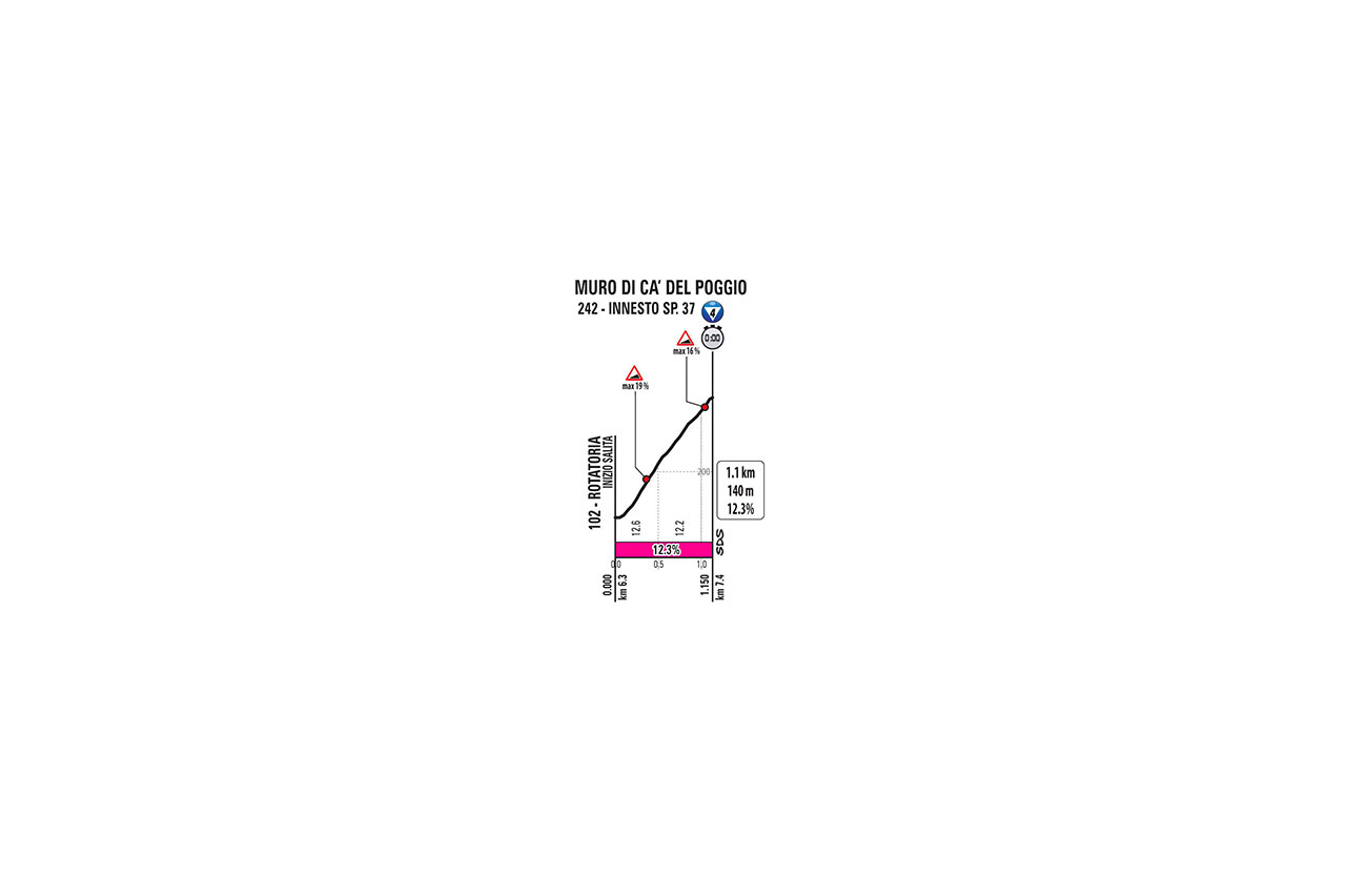 This challenging time trial stage is raced against the background of the Prosecco vineyards. The route (34.1 km) is demanding, and features one categorised climb after just some 7 km, with gradients topping out at 19% (Muro di Ca’ del Poggio). The stage course then winds its way across the hills, undulating continuously along moderately narrow yet perfectly-surfaced roads.