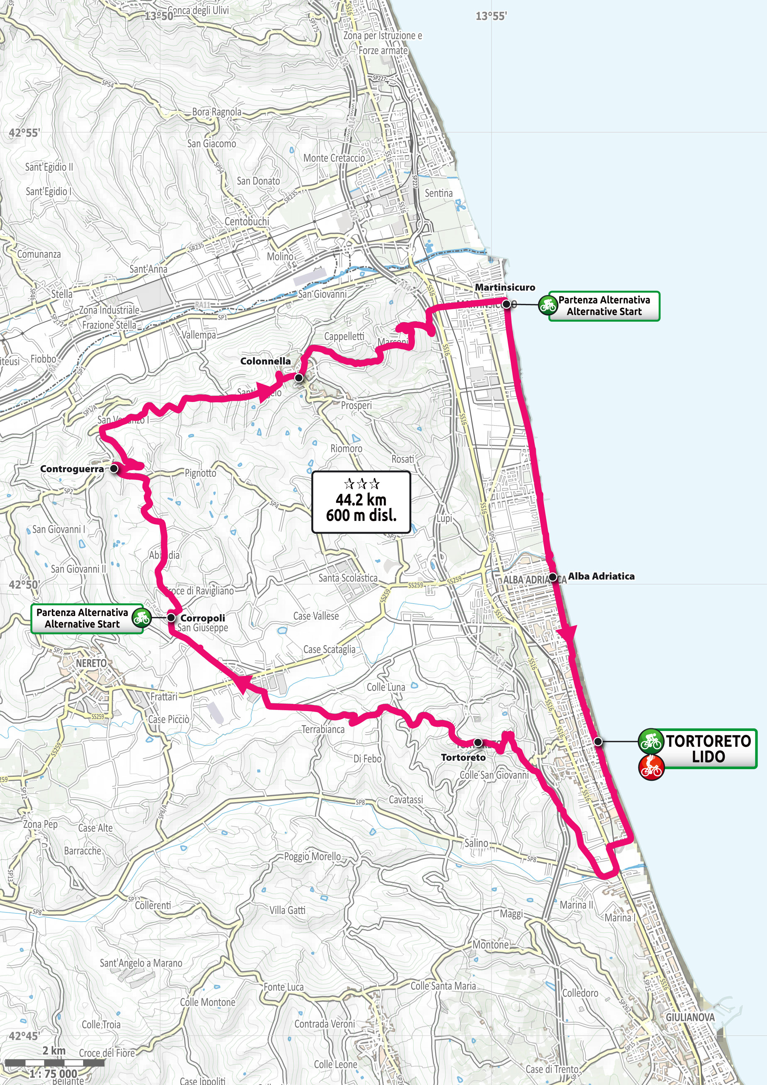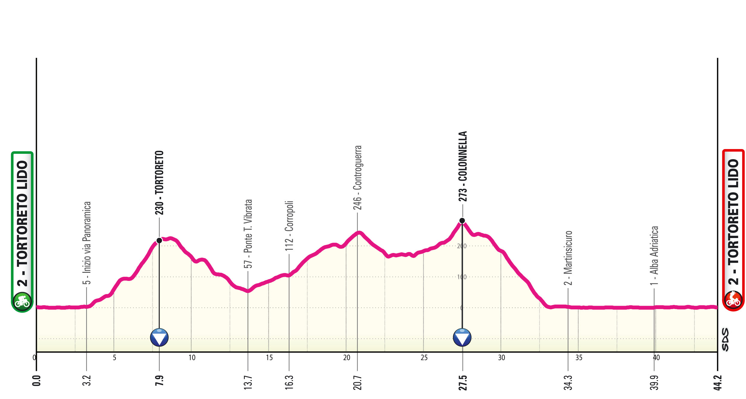 The inland section climbs through Tortoreto, Controguerra, and Colonnella, featuring segments with significant gradients.