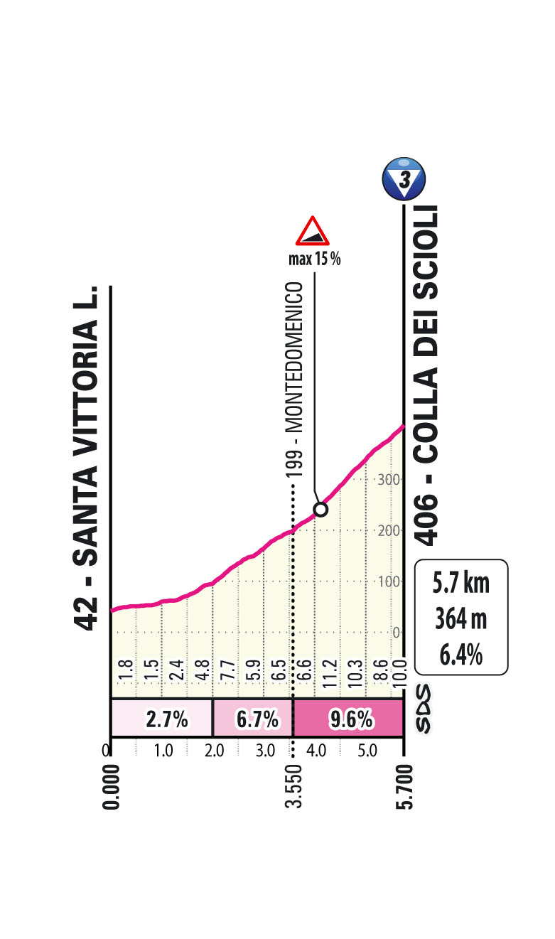 The twisting and technical finale features the Colla dei Scioli, a complete novelty for the Giro: 5.7 km at 6.4%, with a tricky opening section on narrow roads.