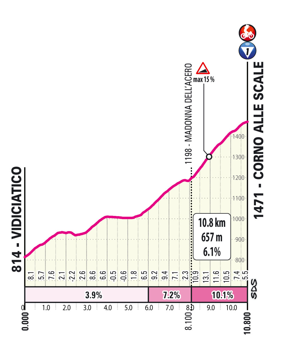 From there, the final climb proper begins, leading to Corno alle Scale and Rifugio Cavone, 10.8 km long at around 6%.