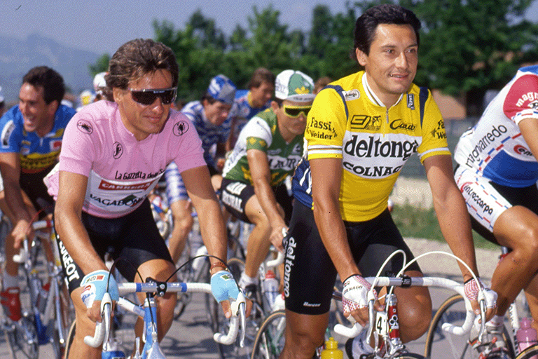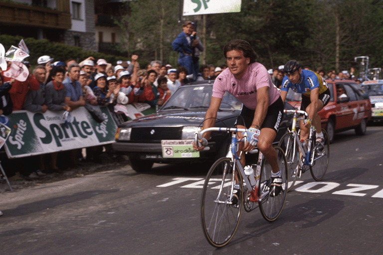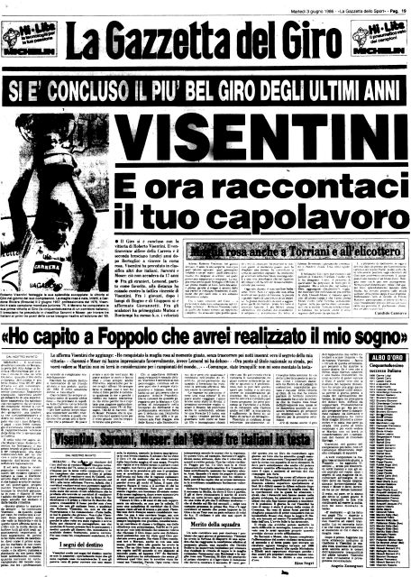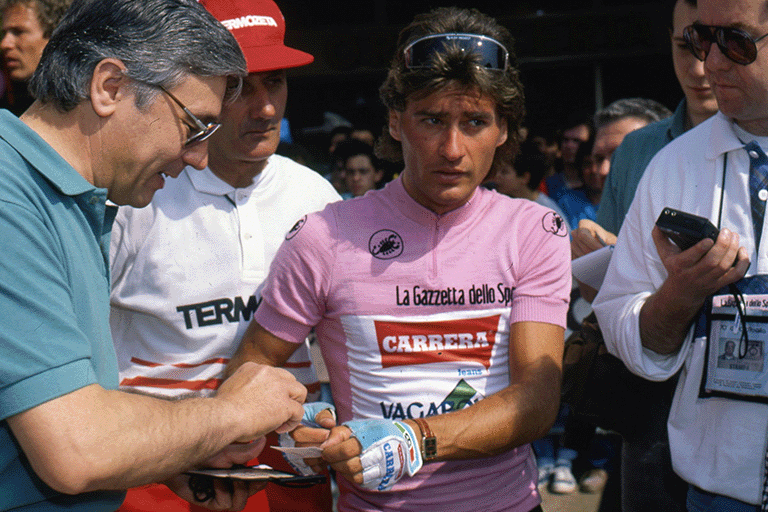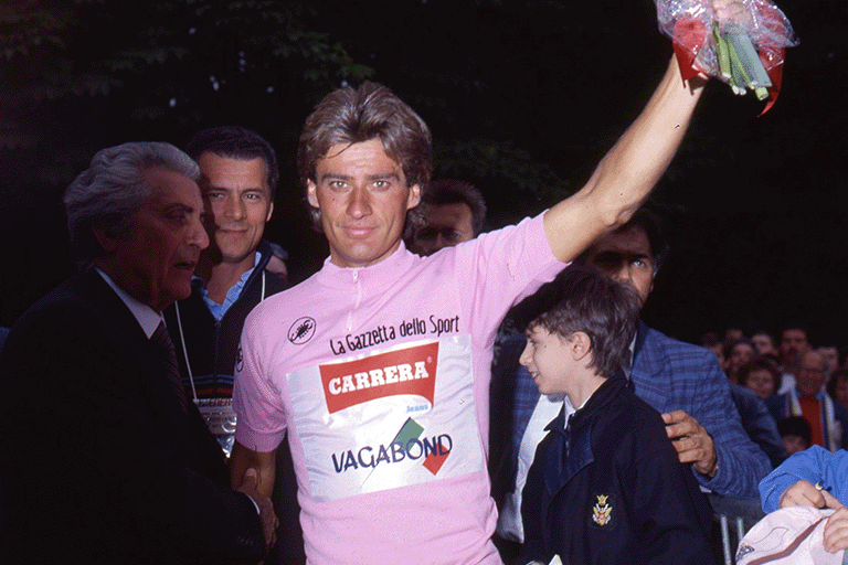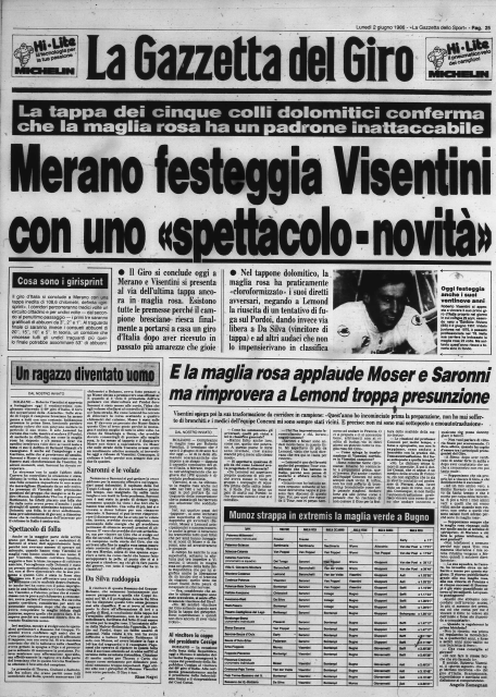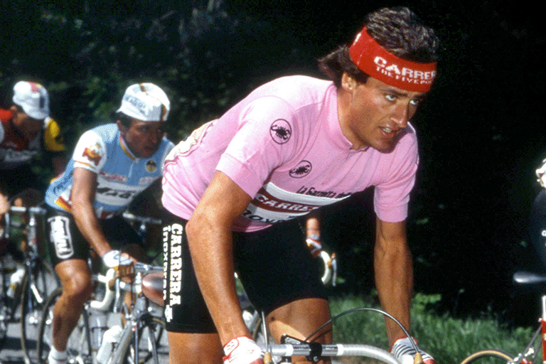 Born in 1957, Roberto Visentini was one of the great protagonists of Italian cycling in the 1980s. After finishing second in the 1983 Giro d'Italia behind Beppe Saronni, he won the Corsa Rosa in 1986, triumphing on his birthday, 2 June. In twelve appearances in the Giro d'Italia, he achieved five stage victories and wore the Maglia Rosa for a total of twenty-seven days, wearing it in five different editions, confirming his career at the highest level.