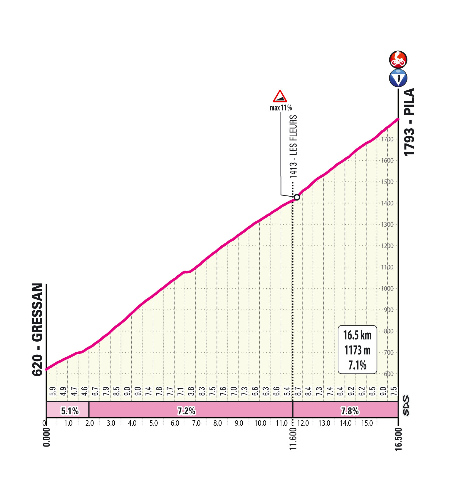 After a long sequence of climbs, the route culminates with the ascent from Gressan: 16.5 km at 7,1%, steady but demanding, set in a stunning Alpine landscape with views of Mont Blanc, the Matterhorn, Monte Rosa and Gran Paradiso.