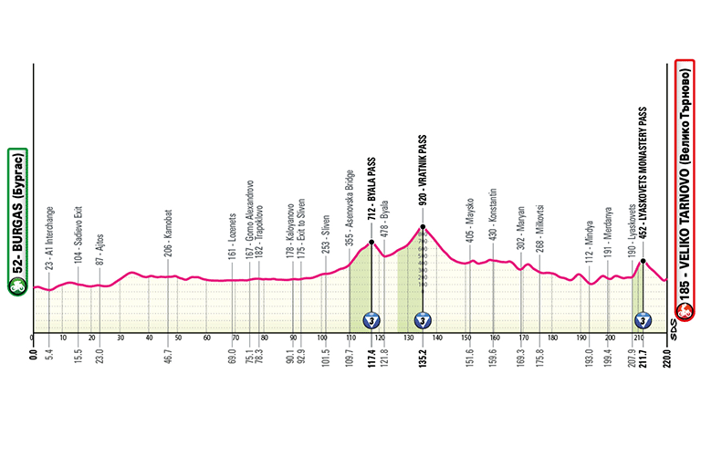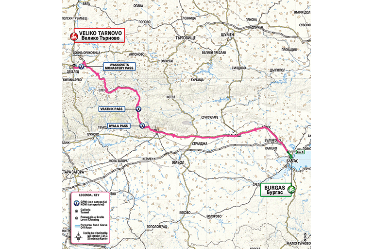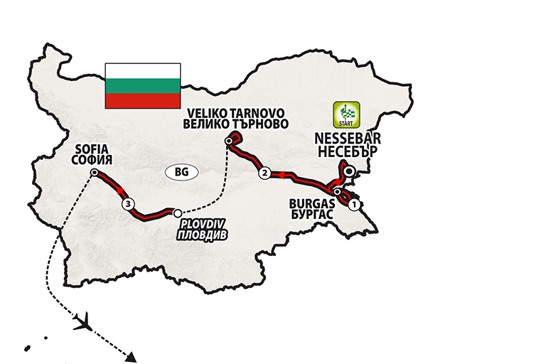Etapa larga y sinuosa. Salida desde Burgas (llegada del día anterior) y recorrido que atraviesa las montañas de la región de Ruse, con dos ascensos, para desembocar en la zona de Veliko Tarnovo, donde antes de la meta los corredores afrontarán la breve y exigente ascensión al Monasterio de Lyaskovets (aproximadamente 3,5 km al 7,5%, con rampas largas de doble dígito en la primera parte) antes de una llegada plana después de unos pocos kilómetros de descenso.
