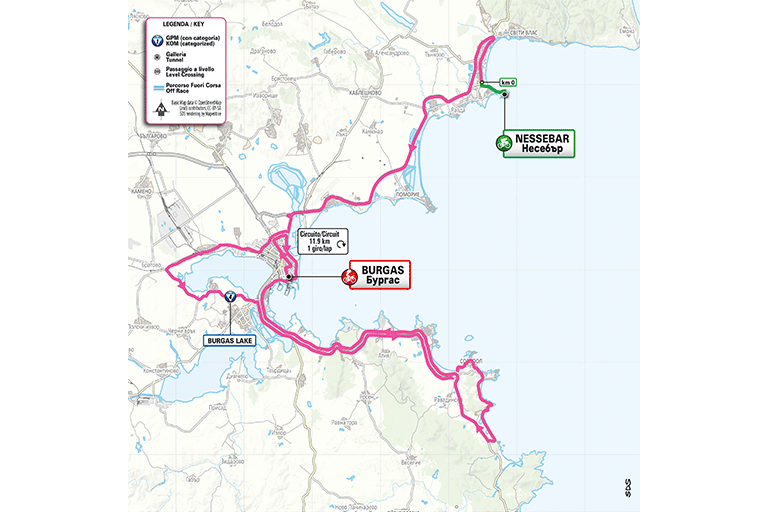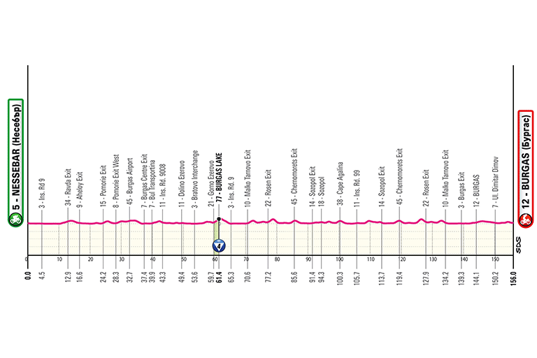 Etapa muy rápida y fundamentalmente llana, apta para los hombres rápidos. La primera Maglia Rosa será muy probablemente un velocista. Se sale desde Nessebar con destino a Burgas, donde se realizará un primer paso por la población pero no por la línea de meta. Se continúa rodeando el lago de Burgas y después se sigue por la costa para volver a la ciudad de llegada, donde una vez se transite por la meta se recorrerá un circuito de 11 km antes del esprint final, que entregará la primera Maglia Rosa sobre una recta final siempre en ligero ascenso.