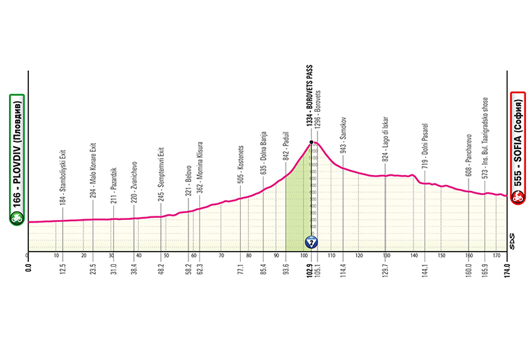 Nueva oportunidad de esprint, que puede complicar, a mitad de recorrido, la larga y tendida ascensión de Borovets, coronada muy cerca del lugar donde se ubica su estación de esquí. Vendrán después unos 70 km de ligero descenso antes de entrar en la capital búlgara. Los últimos 7 km serán prácticamente en línea recta y el esprint es perfectamente llano.