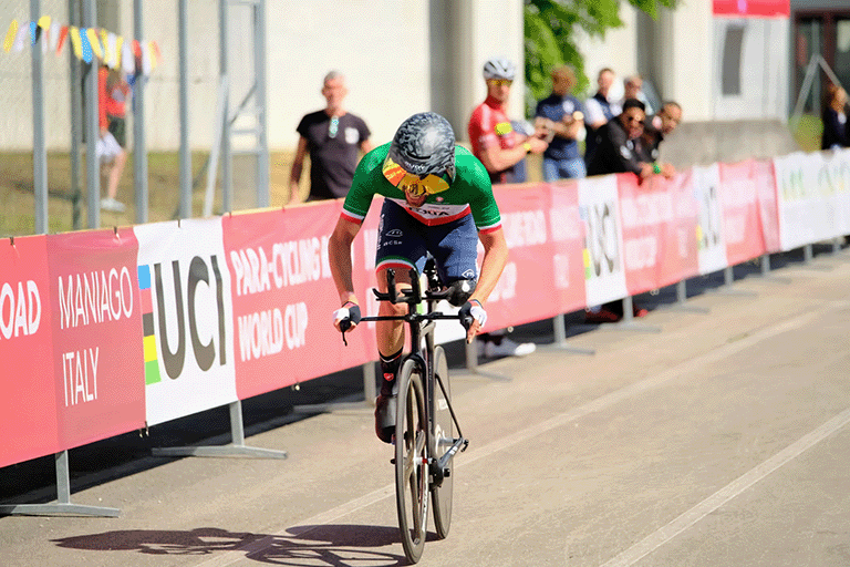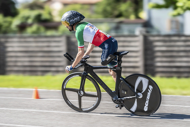 Andrea Casadei: “El aspecto de mi rutina que más sorprende, según las personas con las que he tenido ocasión de relacionarme, es sin duda el volumen de entrenamientos que los atletas paralímpicos solemos soportar junto con la constancia, la meticulosidad y la determinación que ponemos, todo indispensable si se quiere aspirar a ganar algo importante. El volumen de entrenamientos se puede comparar con el de un atleta normodotado, incluso los ejercicios a menudo son los mismos, en bicicleta pero también en el gimnasio. Simplemente tuvimos que adaptarnos encontrando una forma diferente de ejecutarlos. Yo, por ejemplo, hago seis entrenamientos en bicicleta, entre carretera y crono, y dos sesiones de gimnasio a la semana”.